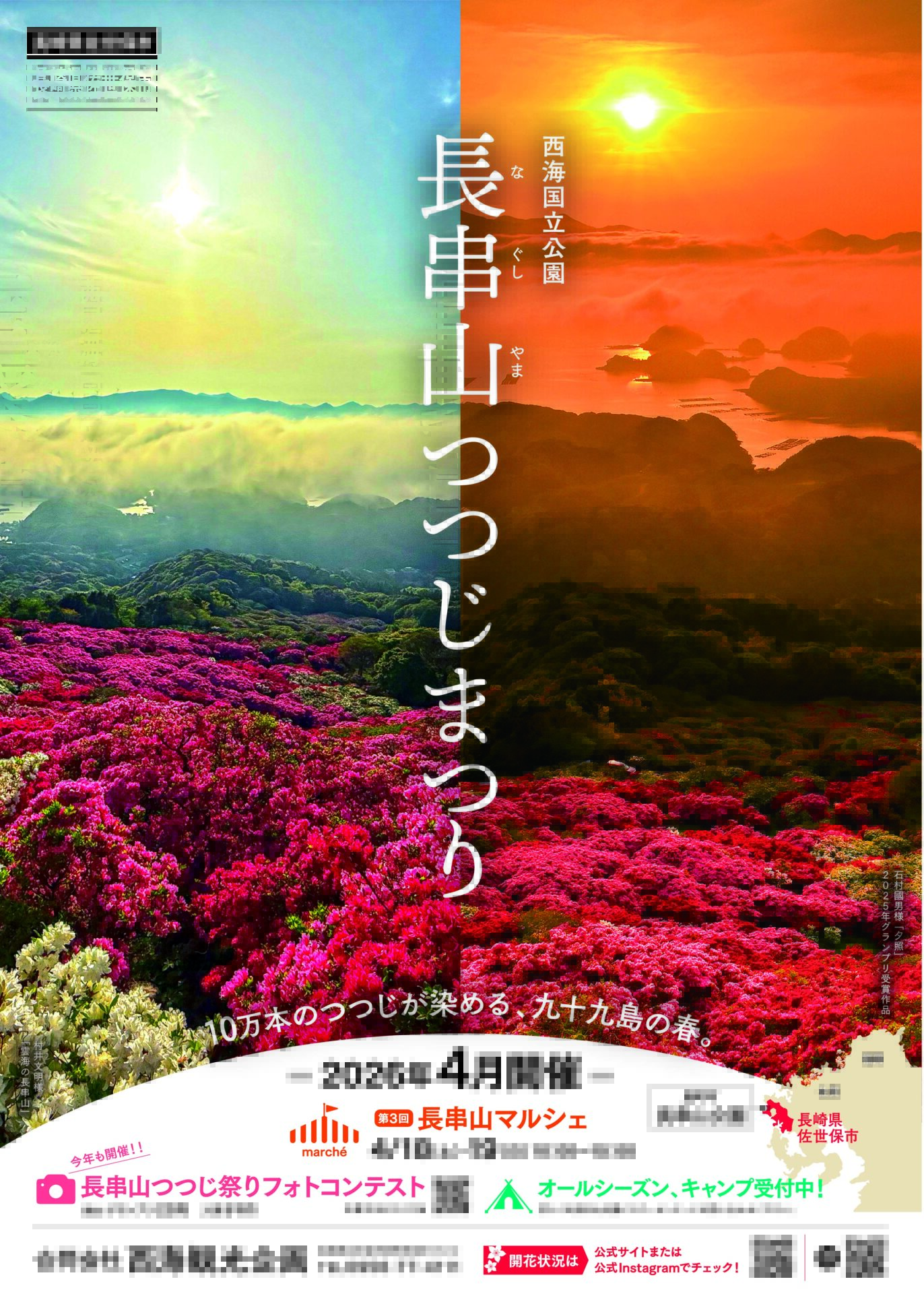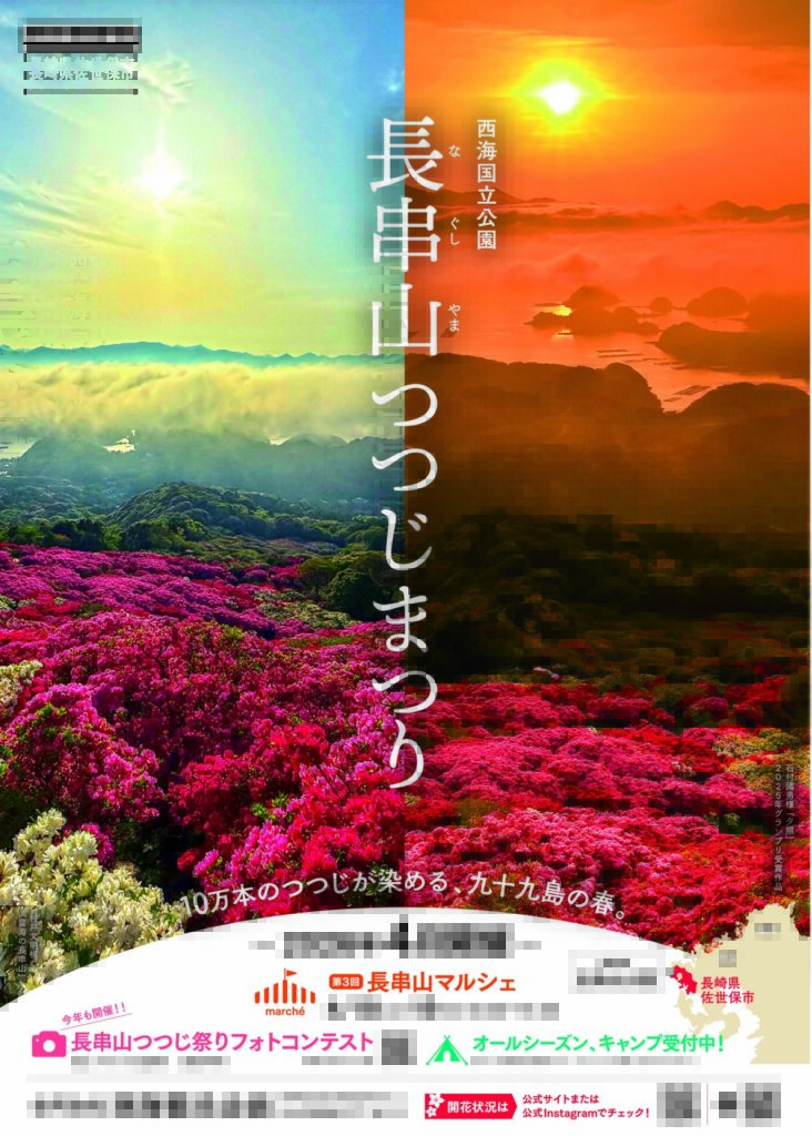 2026年「長串山つつじまつり」のポスターが完成しました!今年も4月に開催いたします。10万本のつつじが山肌を染め上げる、九十九島の春の絶景をぜひお楽しみください。