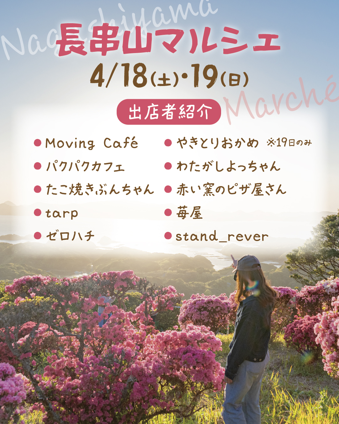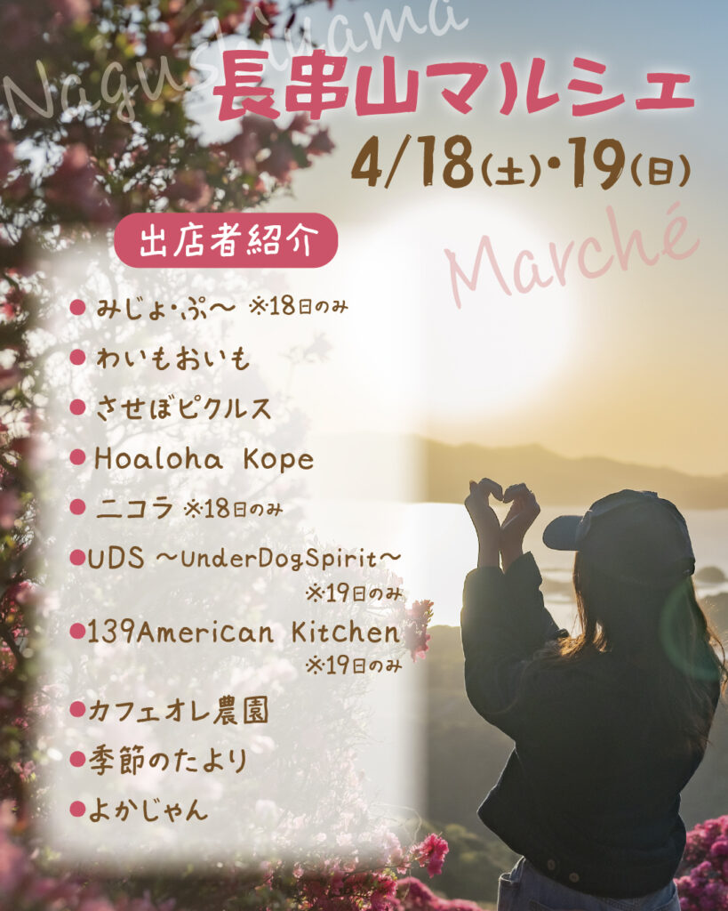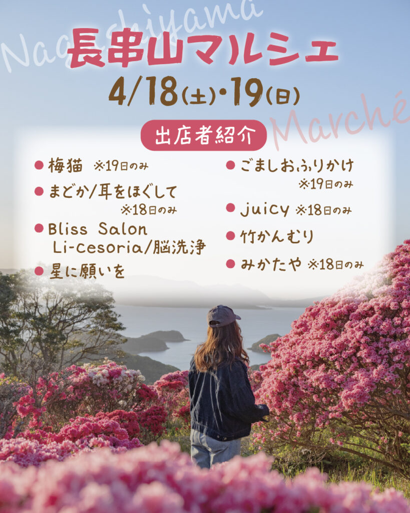 Located in Shikamachi, Sasebo City, Nagasaki, Nagashiyama Park offers a breathtaking view of the Kujukushima islands and 100,000 blooming azaleas. Enjoy fantastic local food, beautiful handmade crafts, and relaxing experiences. Swipe to see our amazing vendor lineup! We can’t wait to see you there✨